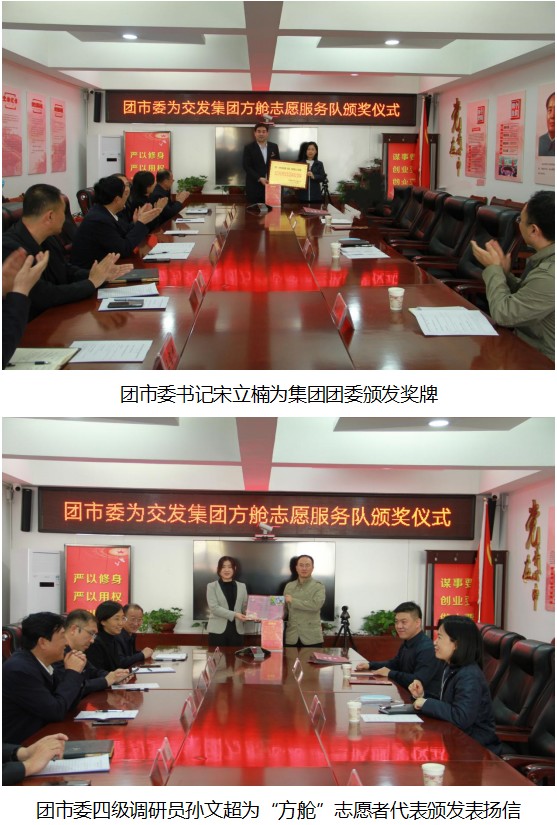 交發集團黨委委員、副總經理李文靜主持會議,交發集團黨委副書記王澎簡要彙報了交發集團誌願服務活動開展情況;團市委孫文超調研員宣讀了感謝信;團市委宋立楠書記為交發集團頒發了獎牌,並對交發集團高度的社會責任感和廣大幹部職工勇於擔當、敢於奉獻的精神給予肯定和讚揚。交發集團黨委書記、董事長劉俊德、黨委副書記、副總經理楊正宇以及集團相關部室領導和誌願者代表參加會議。