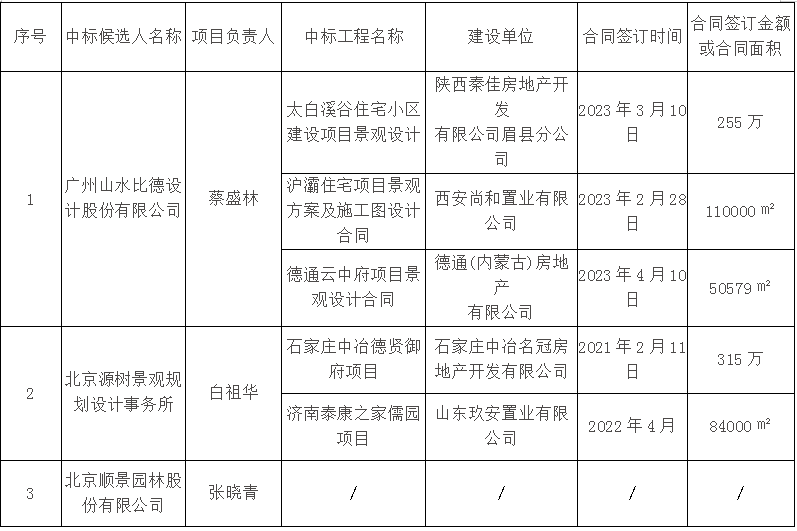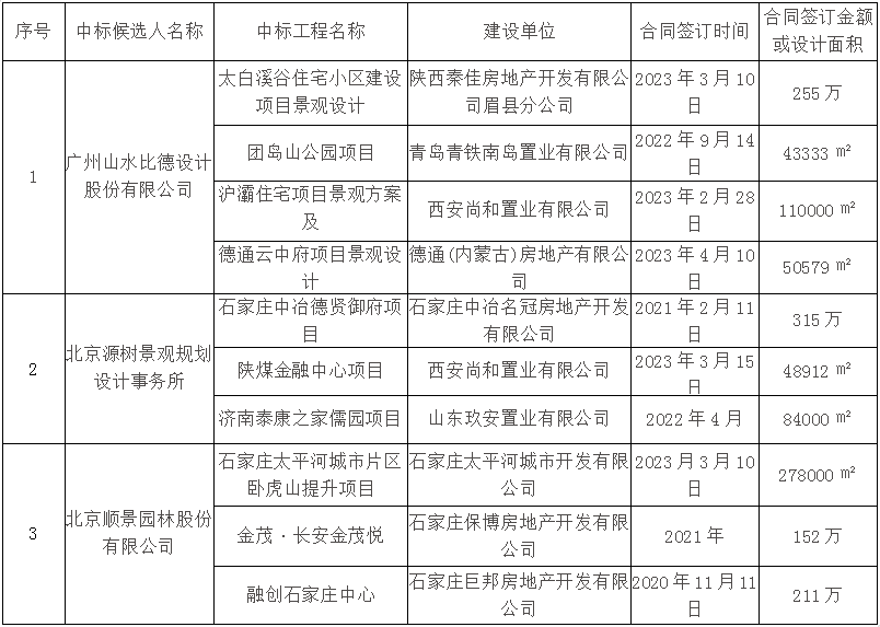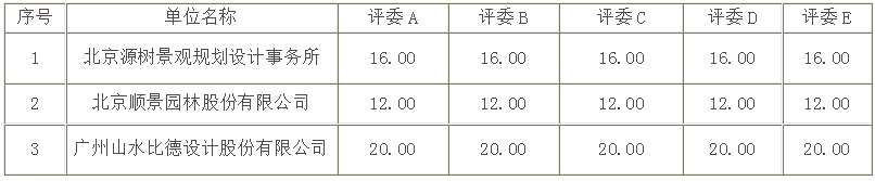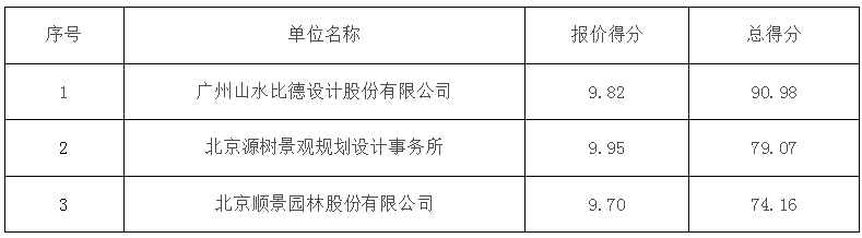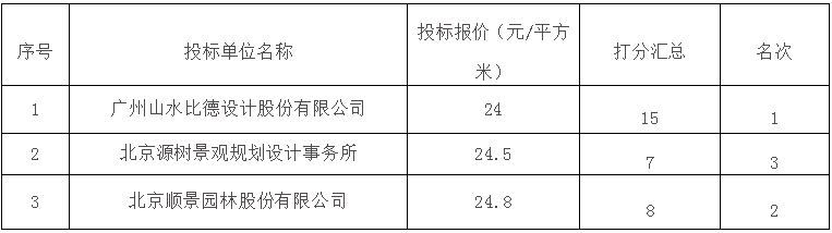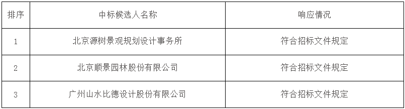 全部投標單位:北京源樹景觀規劃設計事務所、北京順景園林股份有限公司、廣州山水比德設計股份有限公司