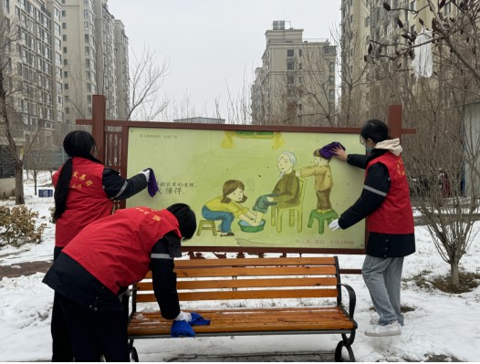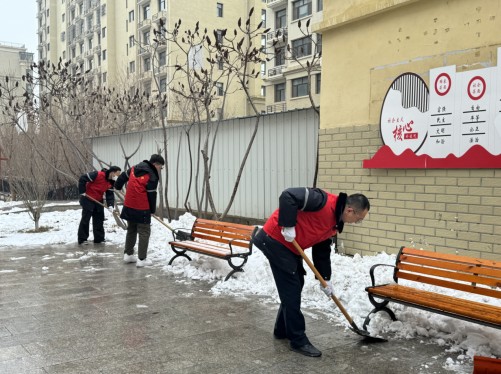 活動中,誌願者們拿上工具,分組深入到轄區角角落落,清理轄區的環境衛生死角。同時當天恰逢2024年的第一場雪,誌願者們也帶上除雪工具積極掃雪。