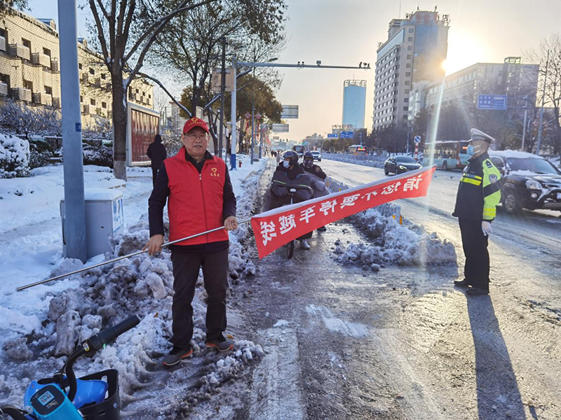 zhiyuanzhemenanshidaogang,zailukoudebutongweizhi,yujiaojingtongzhiyiqidingzheyanhan,yindaoshiminzunshoujiaotongguize,bingxiangtamenxuanchuananquanfaguidengzhishi,quandaojiuzhengbuwenmingjiaotongxingwei。duiluanchuanghongdeng、橫穿馬路、越線等候、逆向行駛、不佩戴頭盔通行的非機動車、行人進行勸導,避免了交通事故的發生,為寒冷的冬日平添了一抹亮色。