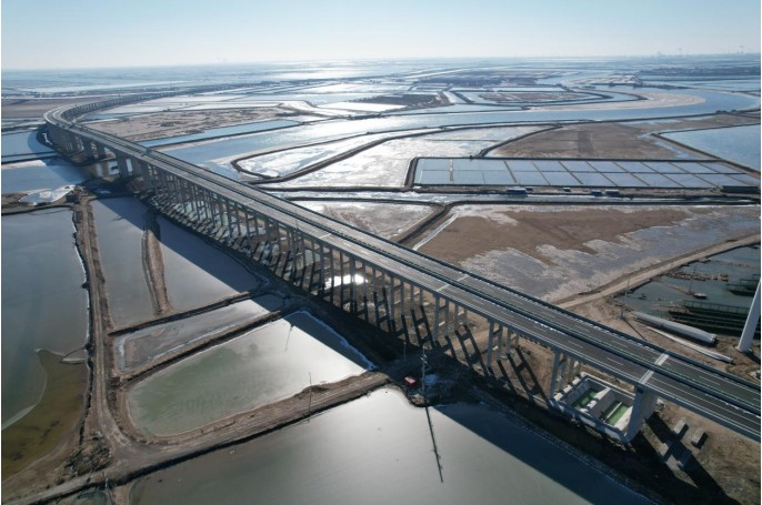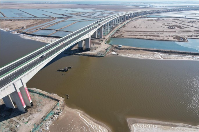據悉,漳衛新河特大橋全長4727.25米,是連接黃大鐵路山東和河北段的重要節點工程。其中,河北段全長1355.37米,北接已建成通車的沿海高速公路滄州段,南接已建成的秦濱高速山東段。主橋跨徑160米,淨空24米,兩項指標均為河北東南部地區之最。大橋采用雙向四車道標準建設,設計時速120公裏。