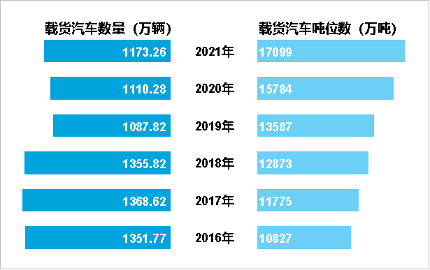 年末全國擁有公路營運汽車1231.96萬輛,比上年末增長5.2%。分結構看,擁有載客汽車58.70萬輛、1751.03萬客位,分別下降4.2%和4.9%;擁有載貨汽車1173.26萬輛、17099.50萬噸位,分別增長5.7%和8.3%,其中,普通貨車406.94萬輛、4923.43萬噸位,分別下降1.7%和增長5.6%,專用貨車60.39萬輛、718.76萬噸位,分別增長19.2%和20.5%,牽引車346.68萬輛、增長11.5%,掛車359.25萬輛、增長7.4%。