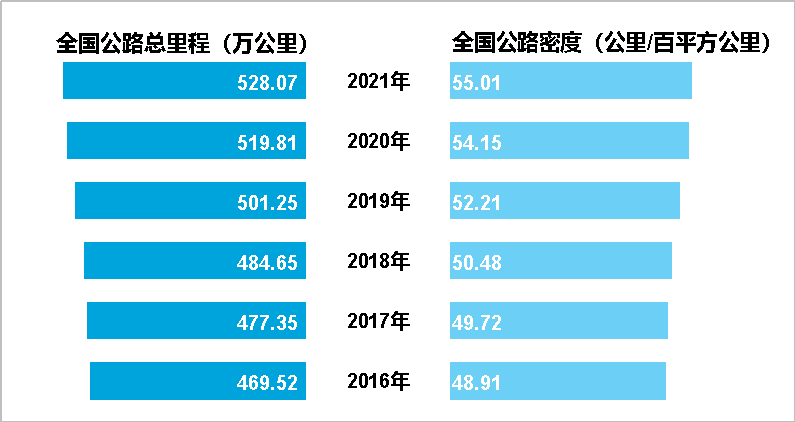 圖2 2016-2021年年末全國公路總裏程及公路密度
