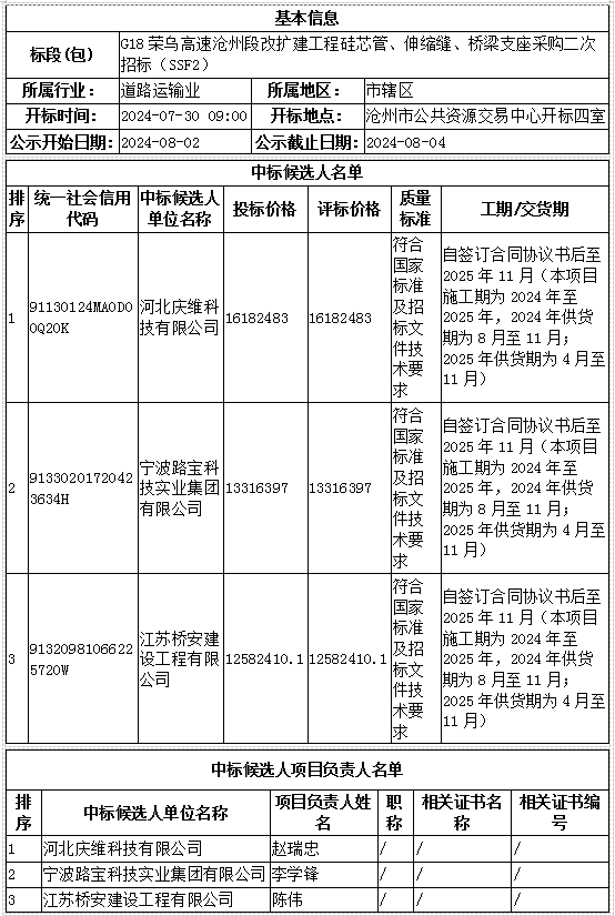 G18榮烏高速滄州段改擴建工程矽芯管、伸縮縫、橋梁支座采購二次招標(SSF2)