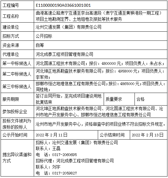 曲港高速公路肅寧互通至京台高速段(肅寧互通至黃驊港段一期工程)項目土地勘測定界、土地組卷及報批等技術服務中標候選人公示