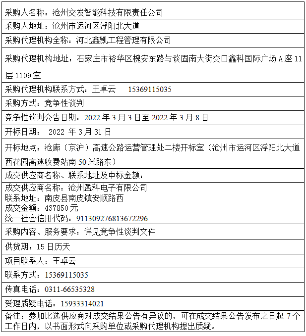 滄州高速公路稽查稽核係統設備采購安裝項目 成交結果公告