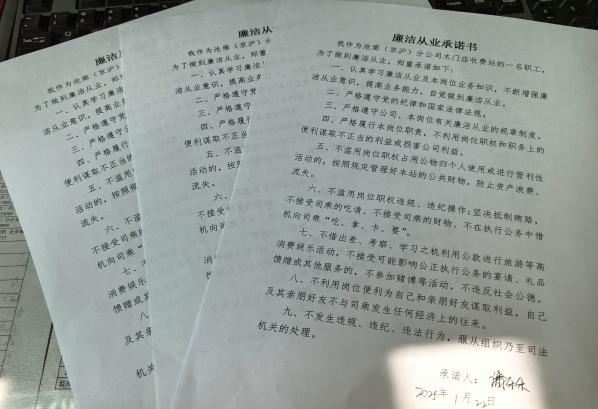 三是組織全體職工簽訂《2025年廉潔從業承諾書》,要求經常性對照承諾書進行自我檢查、自我警示、自我約束,把心思傾注在本職工作中,確保廉潔從業,築牢從業思想防線。