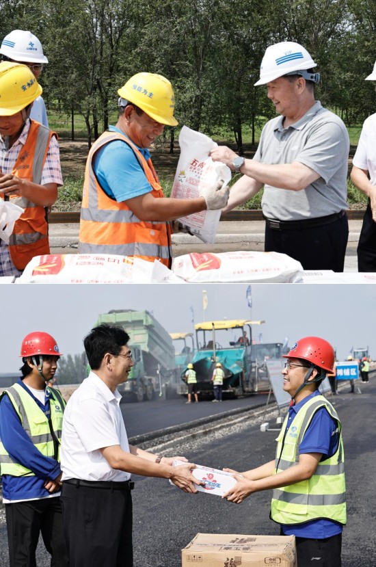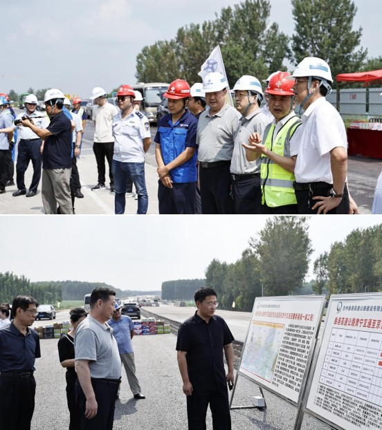 2024年8月14日,河北省交通運輸工會主任魏武、副主任朱麒、任曉亮一行三人到滄州交通發展(集團)有限責任公司榮烏高速改擴建項目、曲港高速公路重點工程勞動競賽項目慰問一線幹部職工。市交通運輸局副局長王鳳廣,局直黨委專職副書記、四級調研員張玉增,交發集團黨委副書記、工會主席楊鴻博,黨委委員、副總經理常誌明陪同。